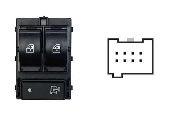 BLOCCO COMANDI ALZACRISTALLI ANTERIORI PORTA ANTERIORE SINISTRA,RETROVISORI ELETTRICI NON RIBALTABILI ELETTRICAMENTE,INTERRUTTORE BLOCCO PORTE (CON LOGO CHIAVE),COLORE NERO,2 INTERRUTTORI 8 PIN CONNETTORE VERDE